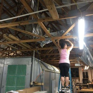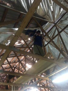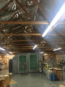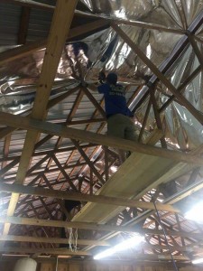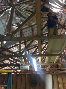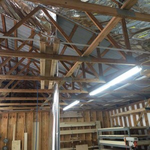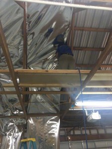 Thanks P.G for sharing your project with us. P.G’s shop is in Central Florida, West of Orlando and was not insulated. With a metal roof, this wood framed building was unbearable in the summer months. P.G. was looking for a tough radiant barrier so we sent down samples of our InfraStop IR radiant barrier, the heaviest and toughest product on the market today.