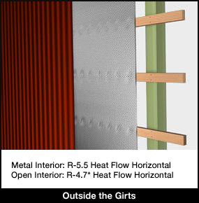 The outside the girt installation method is only available during new construction, before the metal walls are up. The insulation is applied to the exterior of the posts and girts. The metal siding is then attached directly to the girt over the insulation.
